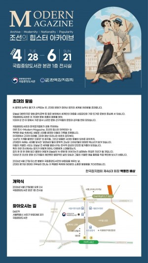 K-컬처의 눈부신 즐기기 시작되는 곳, 근대의 문화가 피어난 잡지의 세계가 열린다.오늘날 대한민국은 영화 문학 등 많은 분야에서 세계인의 마음을 사로잡으며 가장 뜨거운 문화의 중심에 서 있다. 국립중앙도서관은 이 거대한 문화흐름의 원류를 찾아, 100여년 전 이 땅에서 가장 앞서 나갔던 문화 선구자들의 문장과 감각을 한데 모은다.국립중앙도서관과 한국잡지협회가 공동 주최하는 이번 전시 <Modern Magazine, 조선의 힙스터 아카이브>는 척박한 현실 속에서도 새로운 시대를 꿈꿨던 이들의 기록을 조명한다.이국땅에서 고국의 미래를 그리며 펴낸 우리나라 최초의 잡지부터L ‘소년’의 기개를 떨쳤던 ‘신문관’의 잡지들, 그리고 암울한 시대의 등불이 되어준 잡지까지, 근대잡지 속에는 시대를 앞서간 ‘모던보이’들의 문학적 고뇌와 ‘신여성’들의 당당한 목소리가 담겨 있다. 이들의 치열한 시도는 오늘날 전세계를 열광시키는 한국적 감성의 단단한 밑거름이 되었다.특히 이번 전시에서는 잡지가 어떻게 태어나 대중에게 스며들였는지, 잡지 한 장 한 장에 담긴 열망이 어떻게 오늘날의 ‘K-문화’로 이어지는지, 살펴보는 뜻깊은 자리가 될 것이다.100년 전 조선의 문화 선구자들이 제안했던 열정적인 삶의 모습과 그들의 치열한 예술활동을 직접 확인할 수 있는 기회를 제공한다.2026년 4월 27일 따스한 봄볕이 국립중앙도서관의 바람길을 채우는 날, 근대의 향기와 현대의 자부심이 만나는 이 특별한 축제에 소중한 발걸음들을 기대한다.개막식/2026년 4월 27일(월) 오후 2시 국립중아도서관 본관 1층 전시실주소/서울특별시 서초구 반포대로 201 국립도서관