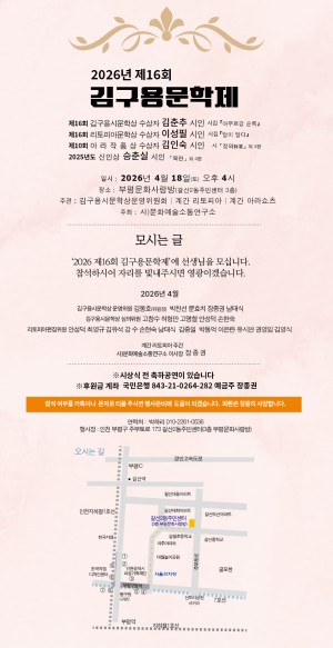 <제16회 김구용시문학상 수상자 김춘추 시인> 사)문화예술소통연구소가 주최하고 계간 리토피아가 주관하는제16회 김구용시문학상 수상자가 선정되었다.수상자는 지난1월 시행된 심사에서김춘추 시인(시집 '아무르강 순록')으로 결정되었다.김구용시문학상은 시류에 편승하지 않고 독창적인 세계를 끊임없이 추구하며 새로운 시에 대한 실험정신이 가득한 시인이 발간한 시집 중 엄정한 심사를 거쳐 선정하여 시상하고 있다.시인 개인의 잠재적인 미래성 평가와 한국시단의 주역으로서의 가능성이 심사의 주요 기준이다. 김춘추시인은1944년 경남 …